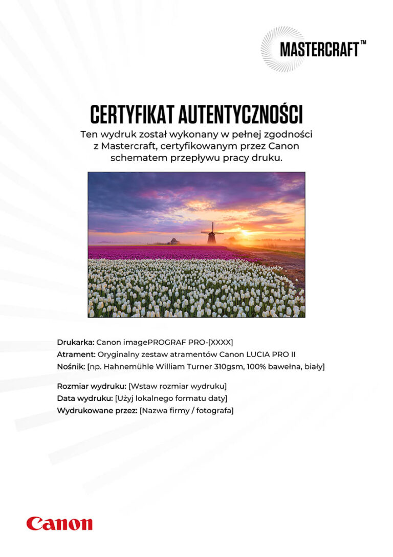 Zlecając wydruk na certyfikowanych mediach w procesie Mastercraft, otrzymujesz również certyfikat autentyczności z pieczęcią — fizyczny dowód jakości i potwierdzenie, że Twoja fotografia została wykonana zgodnie z rygorystycznymi standardami Canon.